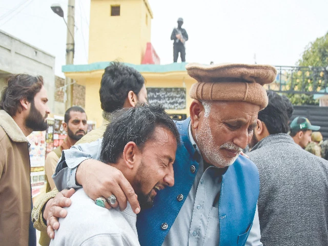 An elderly man tries to console his younger companion, devastated by the death of his loved ones in a suicide attack at an Imambalgah in Islamabad. Photo: Reuters