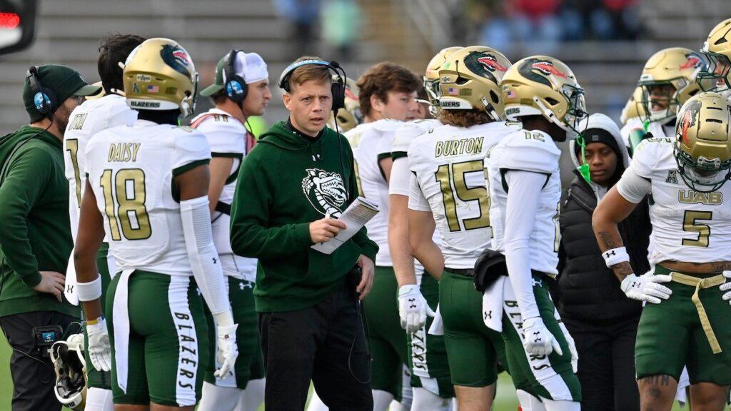 UAB Blazers interim head coach Alex Mortensen on the field during the game as the UAB Blazers face the UConn Huskies on Nov. 1, 2025, at Pratt & Whitney Stadium in East Hartford, Connecticut (Williams Paul/Icon Sportswire via Getty Images)