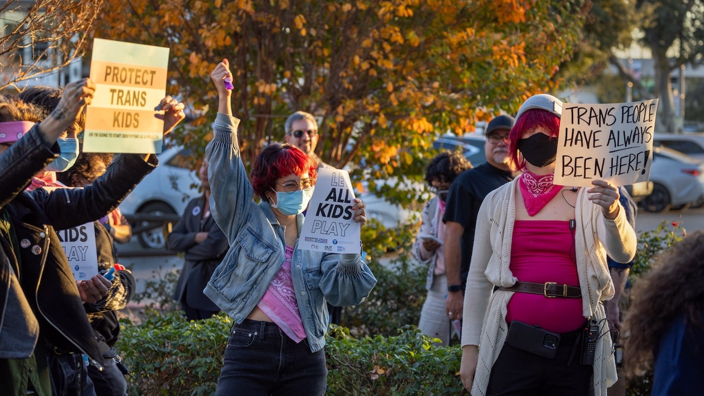 Supporters of transgender athletes hold signs as an overflow crowd converges outside the Riverside Unified School District meeting Thursday night to debate the rights of transgender athletes to compete in high school sports on Thursday, Dec. 19, 2024. (Allen J. Schaben/Los Angeles Times via Getty Images)