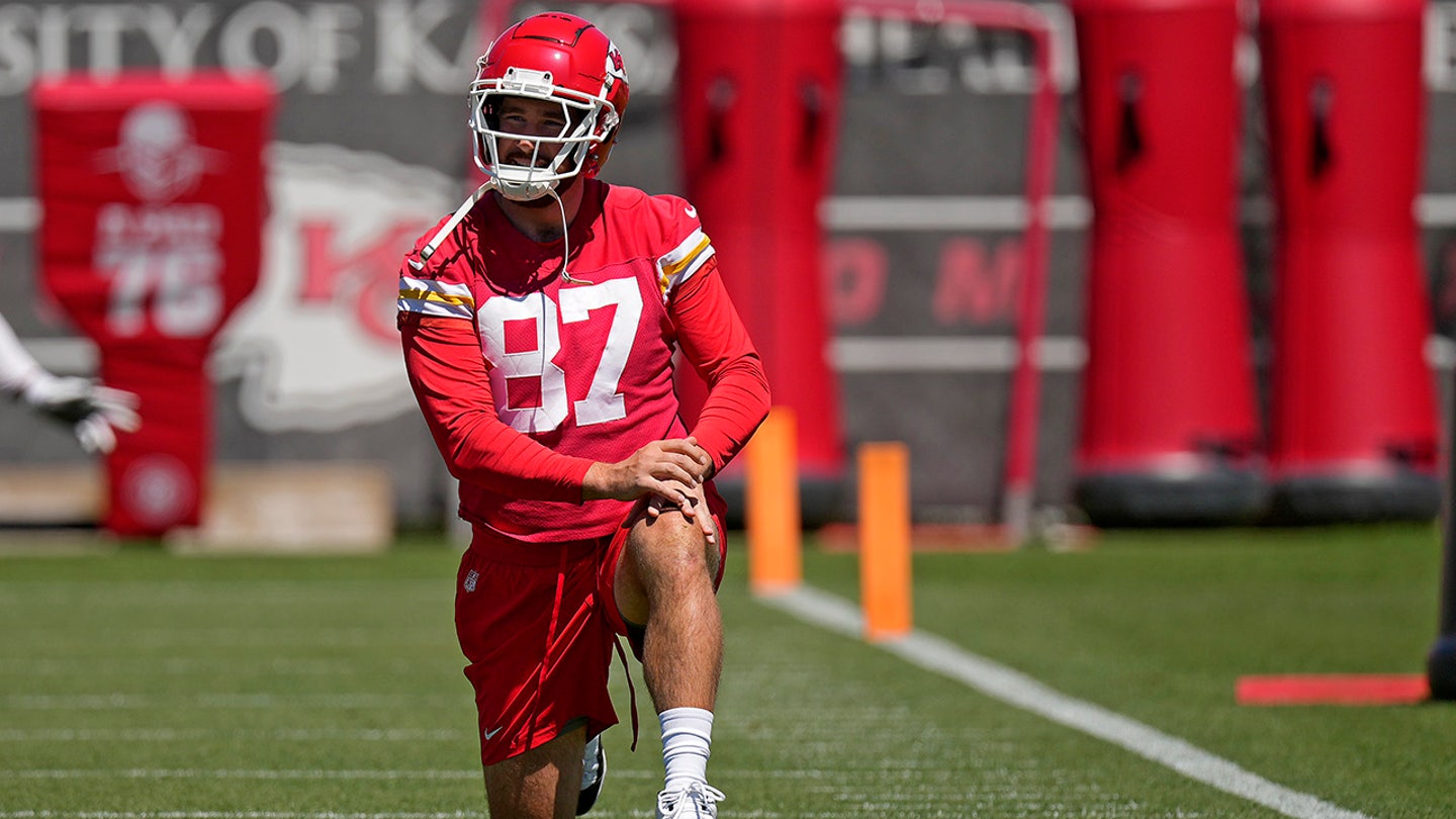 Kansas City Chiefs tight end Travis Kelce stretches during NFL football organized team activities on Friday, June 7, 2024 in Kansas City, Missouri. (Charlie Riedel/AP Photo)