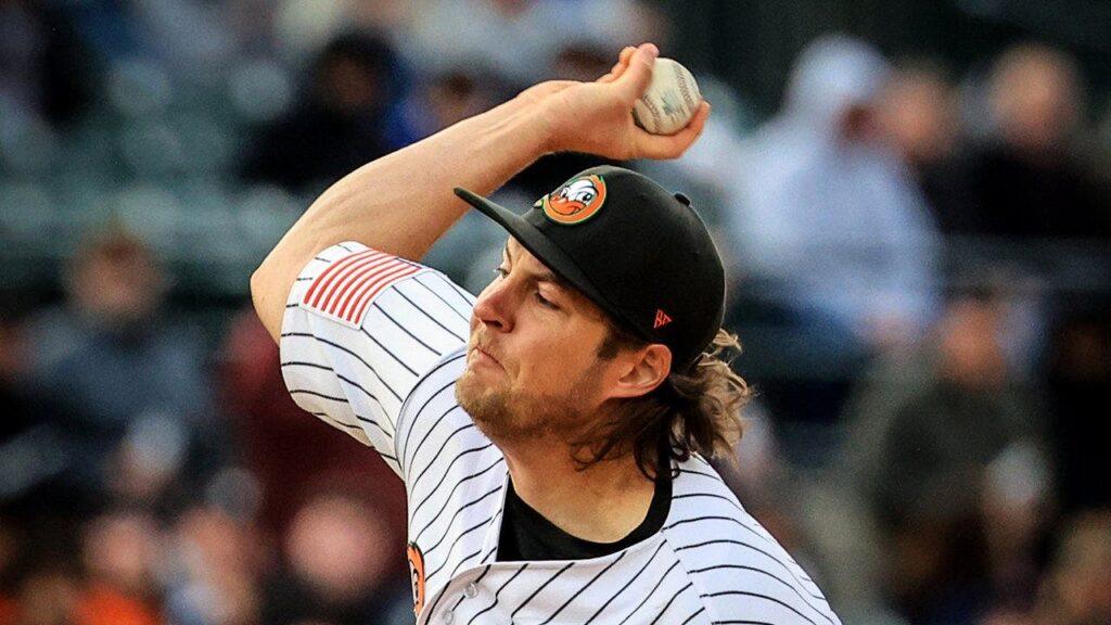 Trevor Bauer pitches for the Long Island Ducks during the no-hitter on Sunday, April 26, 2026. (Jordan McGregor)