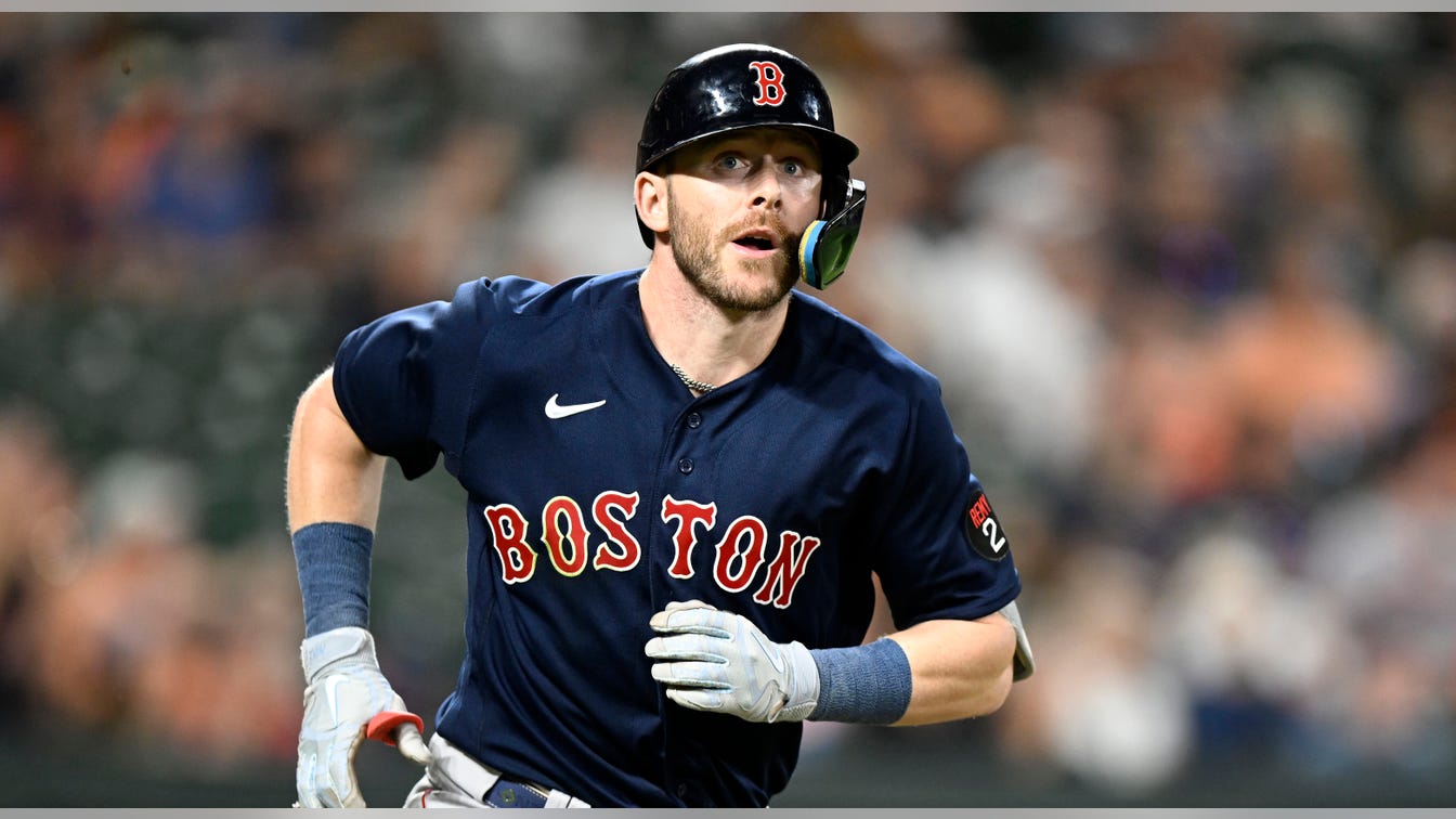 Trevor Story of the Boston Red Sox runs to first base against the Baltimore Orioles at Oriole Park at Camden Yards in Baltimore, Maryland, on September 10, 2022. (G Fiume/Getty Images)