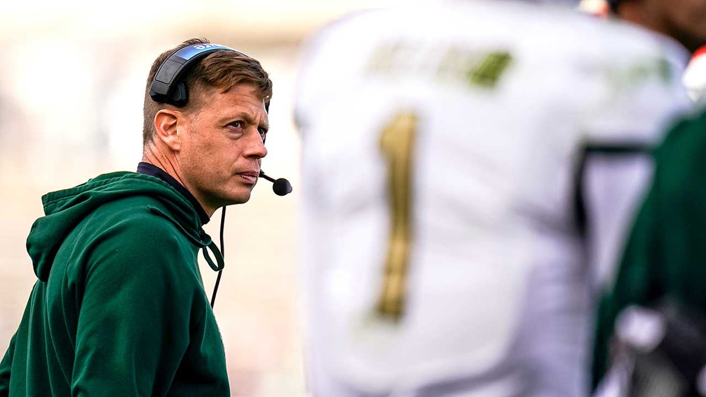 UAB Blazers interim head coach Alex Mortensen watches from the sideline as they face the UConn Huskies at Pratt & Whitney Stadium at Rentschler Field in East Hartford, Connecticut, on Nov. 1, 2025. (David Butler II/Image Images)