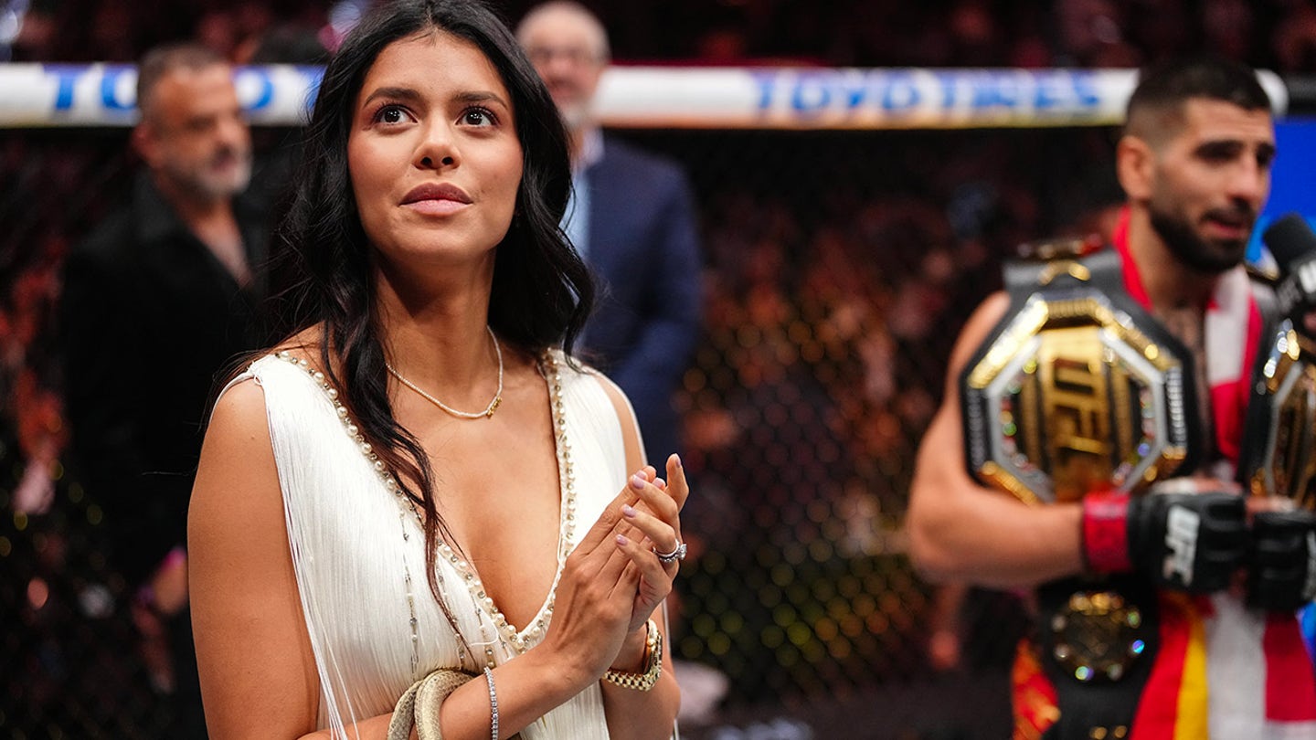 Giorgina Uzcategui Badell watches as her husband Ilia Topuria of Spain is interviewed during the UFC 317 event at T-Mobile Arena on June 28, 2025 in Las Vegas, Nevada. (Jeff Bottari/Zuffa LLC)