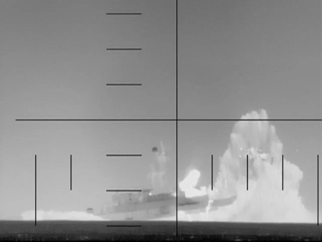 This frame grab from a video released by the US Department of Defense shows what it claims to be periscope footage of a US Navy submarine firing on and sinking an Iranian warship in the Indian Ocean. Photo: AFP