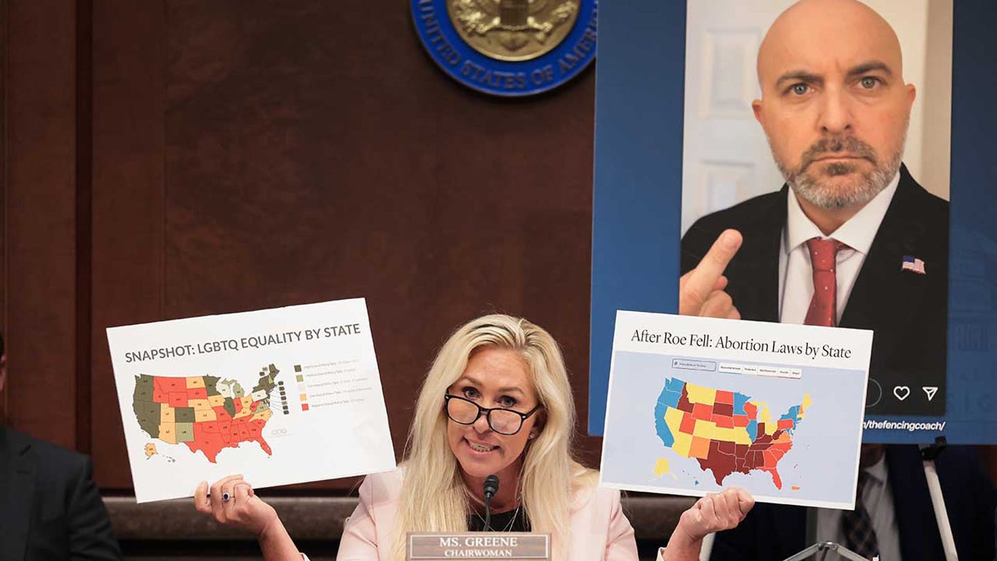 Rep. Marjorie Taylor Greene, R-Ga., holds up U.S. maps in front of an alleged screenshot of USA Fencing board director Damien Lehfeldt’s Instagram during the hearing on “Unfair Play: Keeping Men Out of Women’s Sports” held by the Department of Government Efficiency Subcommittee (DOGE) at the US Capitol on May 7, 2025 in Washington, DC. (Kayla Bartkowski/Getty Images)