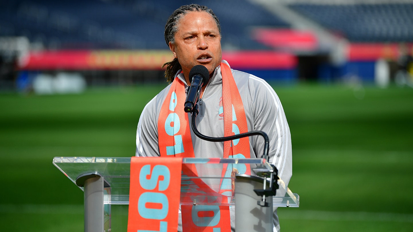 The former soccer player of the United States male team, Cobi Jones, speaks on March 13, 2025 in Inglewood, California, during the presentation of the new test football launch in advance of the game of the Nations League and the World Cup 2026 in the Sofi Stadium. (Gary A. Vasquez/Imagn images)