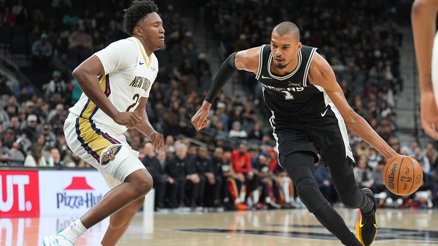San Antonio Spurs forward Victor Wembanyama (1) dribbles against New Orleans Pelicans center Derik Queen (22) in the first half at Frost Bank Center on Jan. 25, 2026. (Daniel Dunn/Image Images)