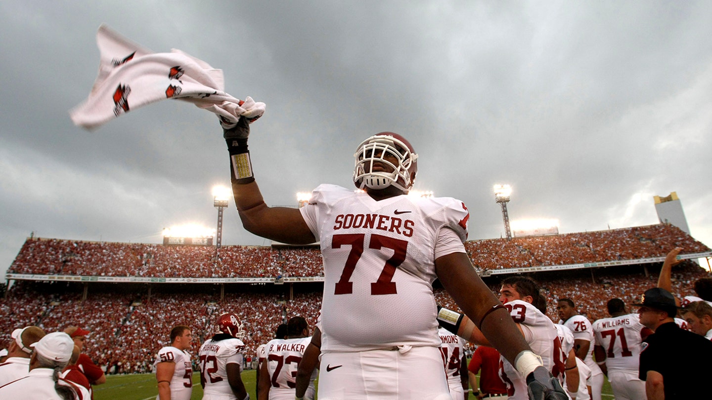 Oklahoma’s Sherrone Moore celebrates after a defensive stop late in the fourth quarter against Texas on Saturday, October 6, 2007, at the Cotton Bowl in Dallas, Texas. (Sharon M. Steinman/Fort Worth Star-Telegram/Tribune News Service via Getty Images)