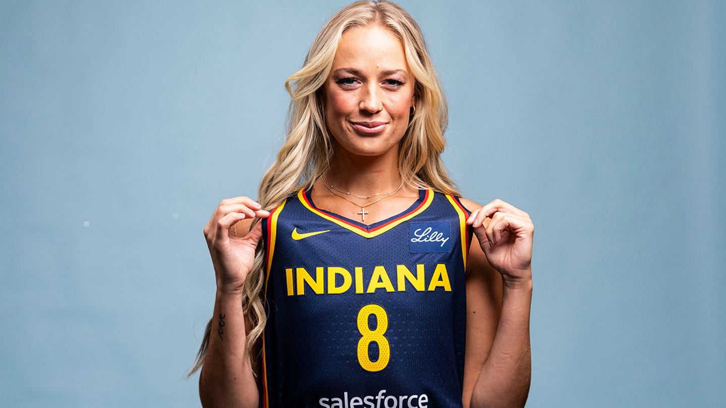 The Indiana fever guard, Sophie Cunningham, poses for a photo on Wednesday, April 30, 2025, during the Indiana fever media day in Gainbridge Fieldhouse in Indianapolis. (Grace Smith/Indiestar/USA Today Network through IMAGN images)