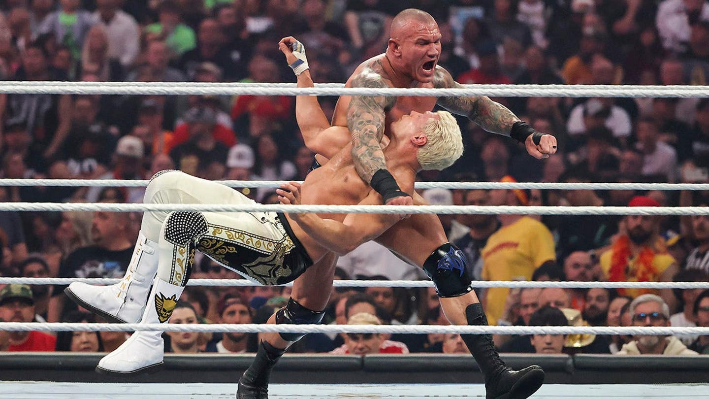 Randy Orton makes contact with Cody Rhodes during their match for the WWE Undisputed Championship on the first night of WrestleMania 42 at Allegiant Stadium in Las Vegas, Nevada on April 18, 2026. (Ethan Miller/Getty Images)