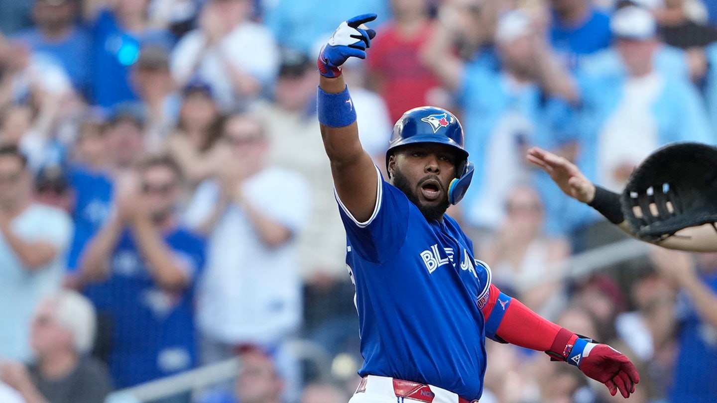 Toronto Blue Jays first baseman Vladimir Guerrero Jr. reacts after a single in the third inning against the New York Yankees during Game 2 of the American League Division Series at Rogers Center. (Kevin Sousa/Image Images)