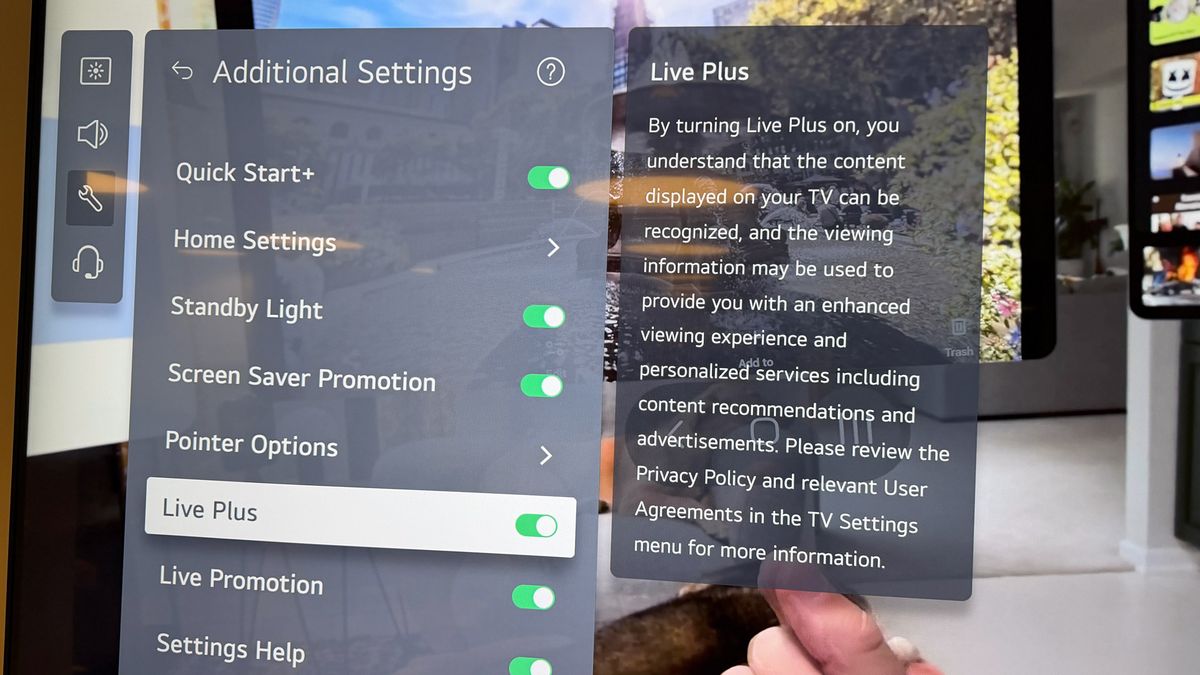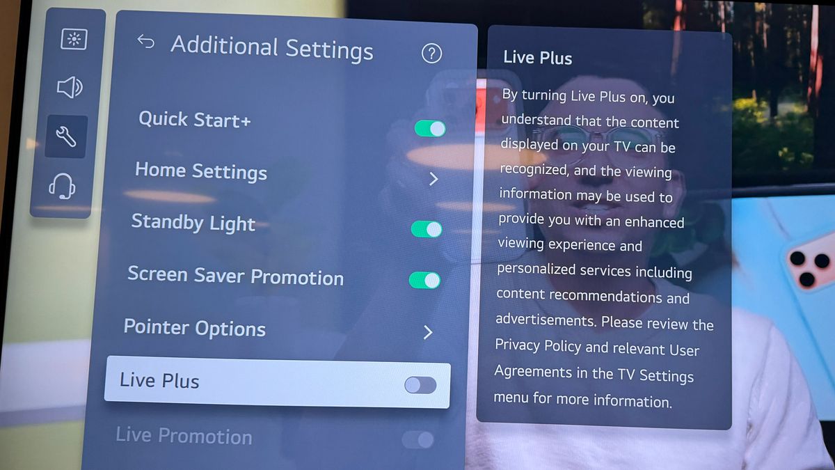 Live Plus is LG’s version of ACR, and as LG describes it, when you enable it, “content displayed on your TV may be recognized and viewing information may be used to provide you with an enhanced viewing experience and personalized services including content recommendations and ads.”